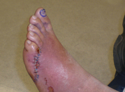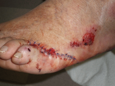 away about six inches of flesh below the pinkie toe, and