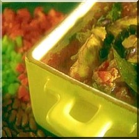 including garbanzos, and water. Drain the liquid over the meat mixture . Remove